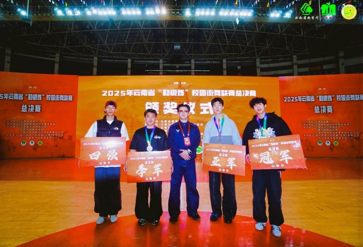 2025年12月4日-8日,2025年云南省“勤锻炼”校园街舞联赛总决赛在大理州奥林匹克中心举办,我校街舞代表队由体育教学部缪哲老师、舞蹈学院李顺祥老师带队,经过三个比赛日的激烈角逐,我校学生代表队分别获得,霹雳舞(Breaking)项目第一名;嘻哈舞(hip-hop)项目一个第一名、一个前八名;团体齐舞项目三等奖。