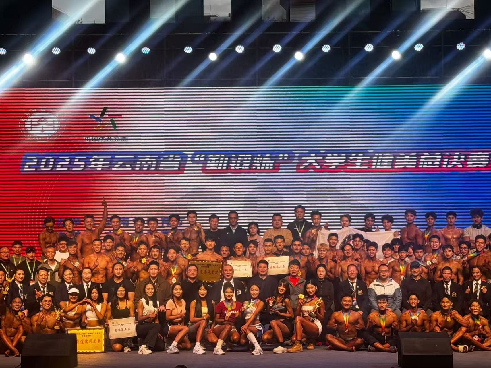 2025年11月14日-16日,2025年云南省“勤锻炼”大学生健美总决赛在文山州民族体育馆举行。云南艺术学院代表队由体育教学部梁伟杰老师领队,杨灿老师和马瑞杰担任教练,带领5名队员共参加4个组别的比赛。在本次比赛中云南艺术学院代表队践行“务实、求新、尚美”的校训,努力拼搏,最终荣获团体总分第六名,以及“体育道德风尚奖”。在个人项目中斩获以下佳绩:女子运动宝贝全场冠军总决赛第一名;女子运动宝贝B组第一名;本科、高职高专组男子健体B组第一名;男子健体全场冠军总决赛第三名;.博研组男子健体公开组第三名;本科、高职高专男子健体B组第四名。杨灿老师获优秀教练员奖。
